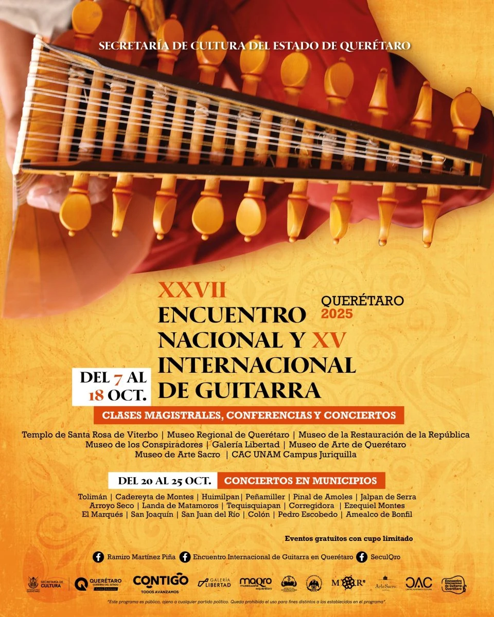 Arrancó el XXVII Encuentro Nacional y XV Internacional de Guitarra Querétaro 2025, evento que se ha convertido en un importante foro para concertistas locales, nacionales e internacionales, con la participación de diferentes instituciones culturales, ensambles de música de cámara, orquestas sinfónicas, investigadores, compositores, lauderos y grupos de música mexicana como el mariachi y el huapango.