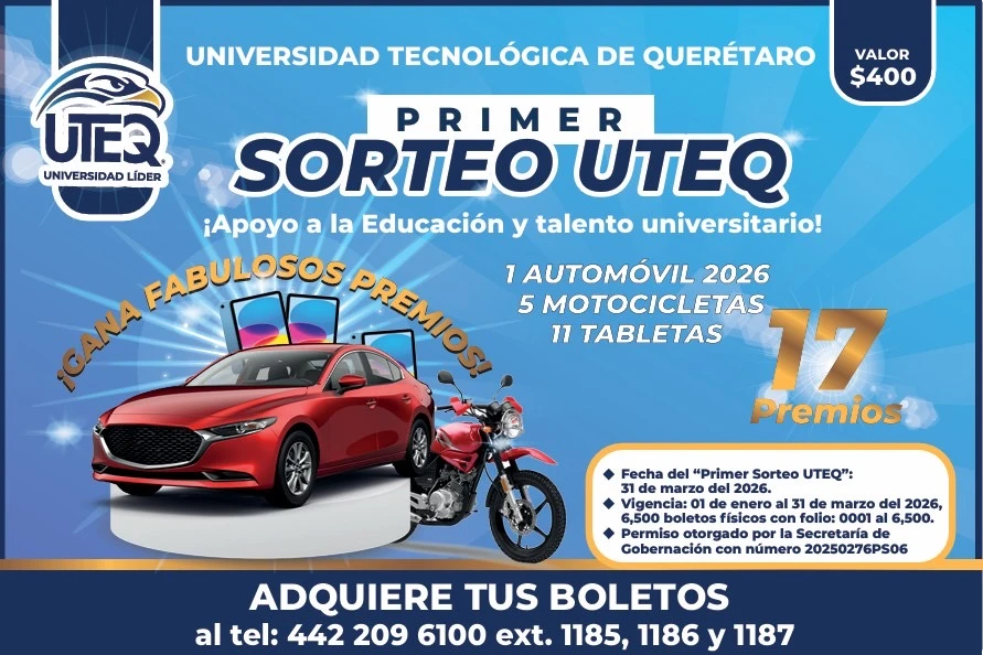 Cabe señalar que el Primer Sorteo UTEQ cuenta con el permiso de la Secretaría de Gobernación número 20250276PS06, lo que garantiza su legalidad, transparencia y confiabilidad. Para la adquisición de boletos los interesados pueden comunicarse vía telefónica al 442 209 6100 extensión 1185, 1186, y 1187.