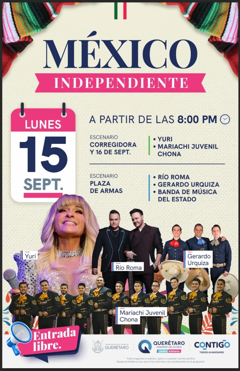 Posterior a esta ceremonia solemne, comenzará el concierto gratuito de la artista Yuri con el Mariachi Juvenil Chona, en la esquina de 16 septiembre y Corregidora, en donde se espera una concentración de entre ocho y 10 mil personas. Mientras que en Plaza de Armas se presentará también de manera gratuita, la Orquesta de Música del Estado de Querétaro y el cantante Gerardo Urquiza, con una asistencia de un promedio de cinco mil personas.