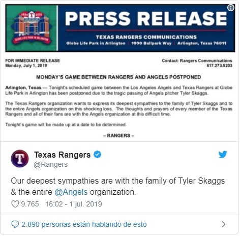 «Con gran tristeza informamos que Tyler Skaggs falleció el día de hoy en Texas. Tyler ha sido y siempre será parte importante de la familia de los Angelinos. Nuestros pensamientos y oraciones están con su esposa Carli y toda su familia durante este tiempo devastador», dijeron los Angelinos en una declaración
