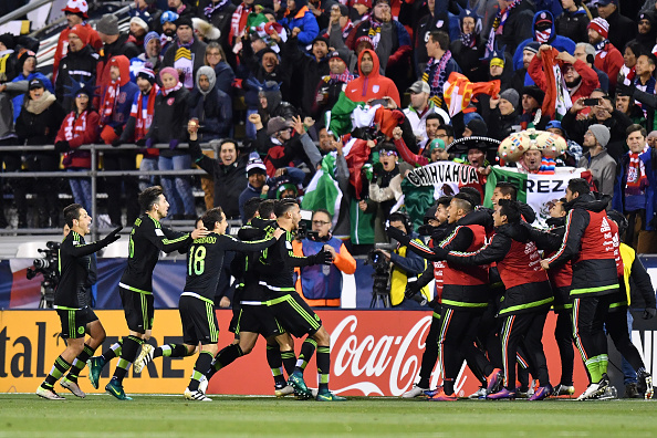 COLUMBUS, OH - NOVEMBER 11: Miguel Layun #7 of Mexico is swarmed by his teammates after scoring a goal in the first half against the United States during the FIFA 2018 World Cup Qualifier at MAPFRE Stadium on November 11, 2016 in Columbus, Ohio. (Photo by Jamie Sabau/Getty Images)