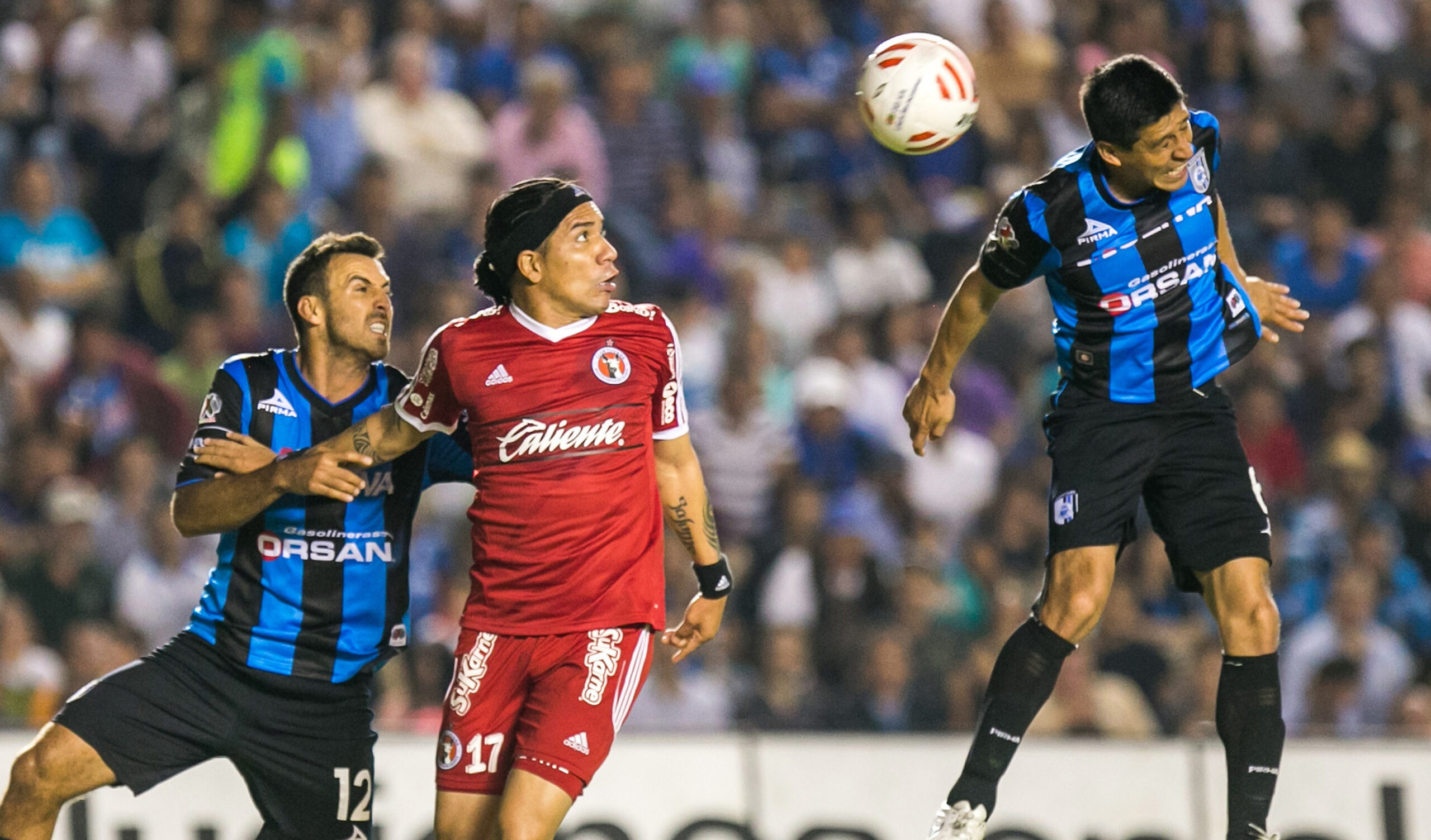 Action photo during the match Queretaro vs Tijuana, corresponding to the round 13 of Clausura 2015 League BBVA Bancomer MX , in the photo : (I)-(D), Jonathan Bornstein of Queretaro, Dayro Moreno of Tijuana and Ricardo Osorio of Queretaro Foto de accion durante el partido Queretaro vs Tijuana , correspondiente a la ronda 13 del Torneo Clausura 2015 de la Liga BBVA Bancomer MX , en la foto : (I)-(D), Jonathan Bornstein de Queretaro, Dayro Moreno de Tijuana y Ricardo Osorio de Queretaro 10/04/2015/MEXSPORT/Emiliano. Estadio: La Corregidora de Queretaro