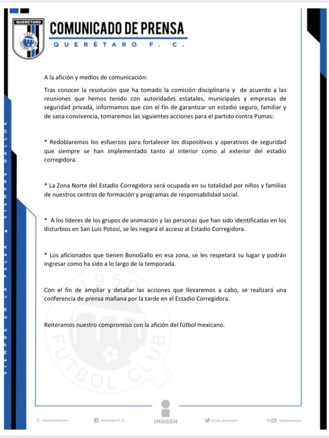 Ante ello, el cuadro de Gallos Blancos, con el objetivo de evitar que se repita algo similar, dio a conocer una serie de medidas a cumplir de cara al choque contra los Pumas, que se jugará en la Corregidora.