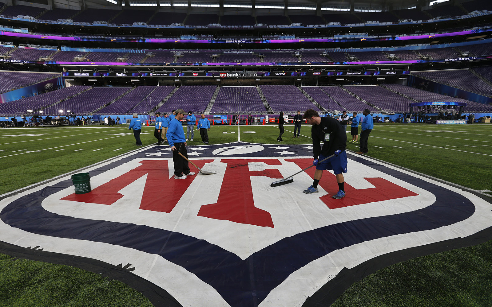 MINNEAPOLIS, MN - FEBRUARY 2: Workers clean the NFL logo at midfield at U.S. Bank Stadium in Minneapolis, MN during the lead-up to Super Bowl LII, where the New England Patriots will face the Philadelphia Eagles, on Feb. 2, 2018. (Photo by Bill Greene/The Boston Globe via Getty Images)