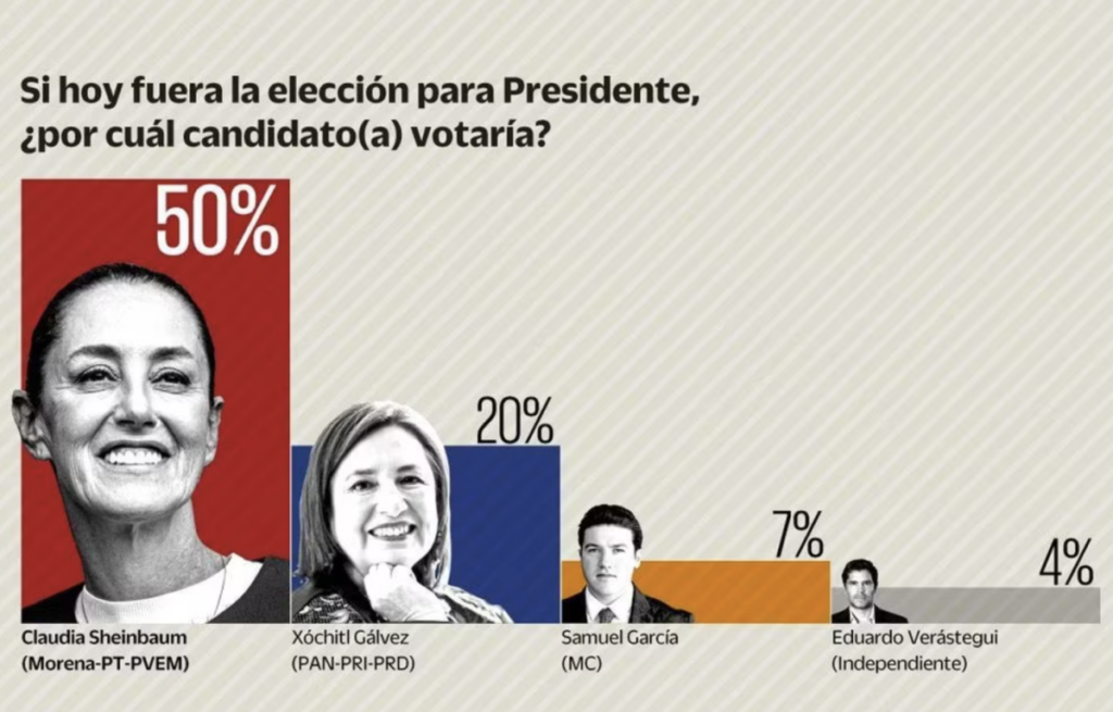 De acuerdo con una encuesta realizada por Buendía & Márquez para El Universal, Morena y su virtual candidata a la Presidencia, Claudia Sheinbaum, aventajan a la coalición opositora y a su abanderada, Xóchitl Gálvez.