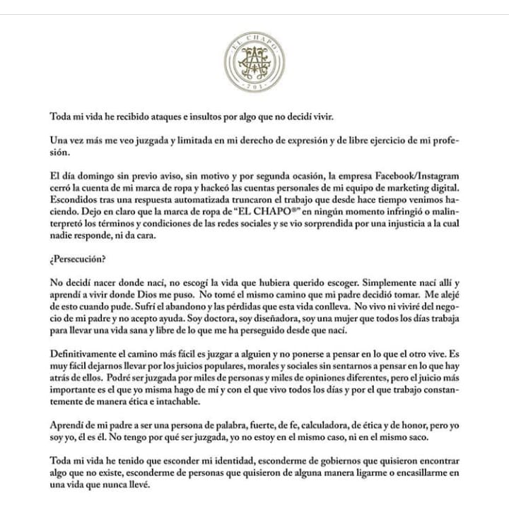 A lo que Emma salió a la defensa de su marca diciendo “que la marca del CHAPO jamás había infringido los términos y condiciones de las redes sociales”