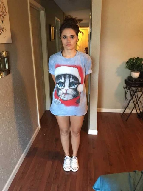Las autoridades dicen que cuando entraron a la casa encontraron a Day sentada en el piso de la sala, con las luces apagadas, velas encendidas, una camiseta de gato navideño y pantalones cortos de entrenamiento. Admitió haber enviado fotos en «sujetador y panty», y admitió haber recibido fotos de los genitales del niño.