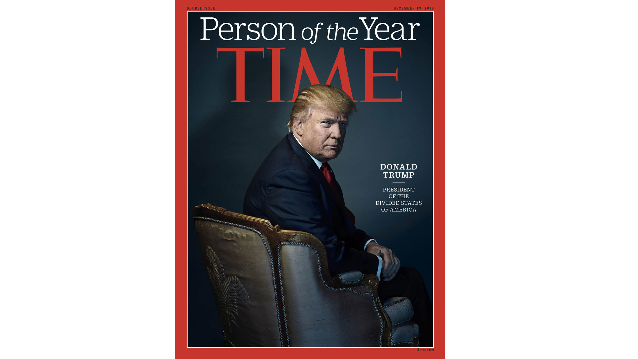 Bajo la leyenda, “Donald Trump, presidente de los Estados Divididos de América”, la portada de Time muestra una imagen de Trump sentado en un elegante sillón con toques dorados, mirando directamente a la cámara en posición retadora.