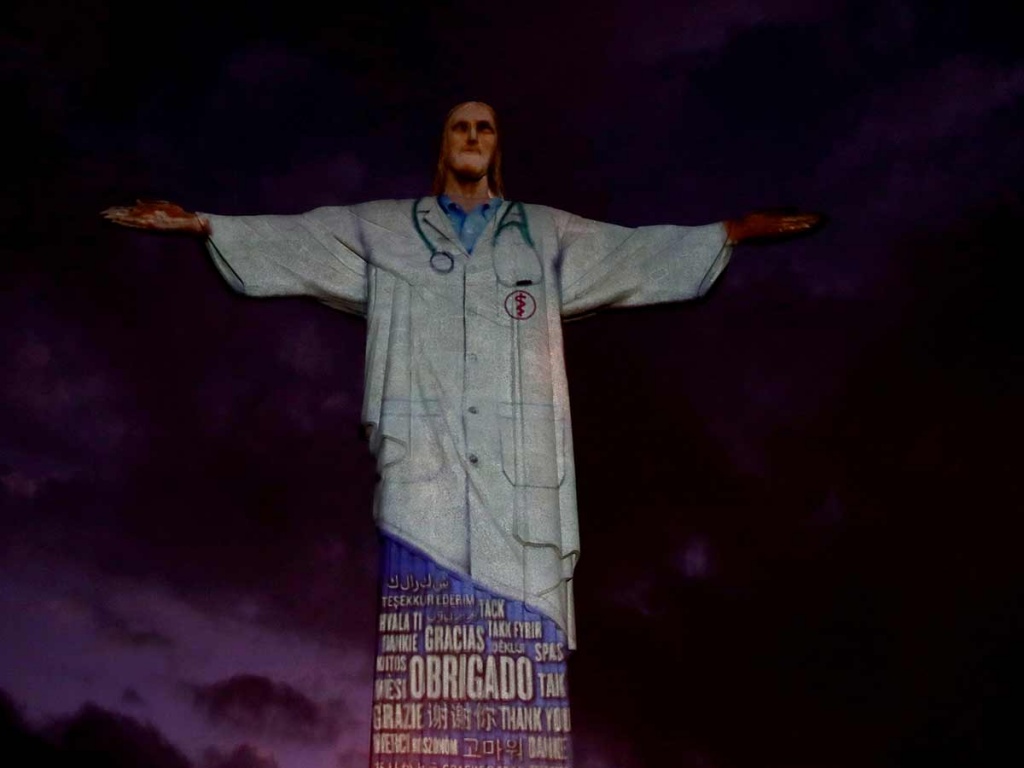 14 abril.- El Cristo Redentor de Río de Janeiro se vistió de médico en homenaje a los galenos y todo el personal de salubridad que trabaja para contener la pandemia de Coronavirus que azota al país sudamericano.
