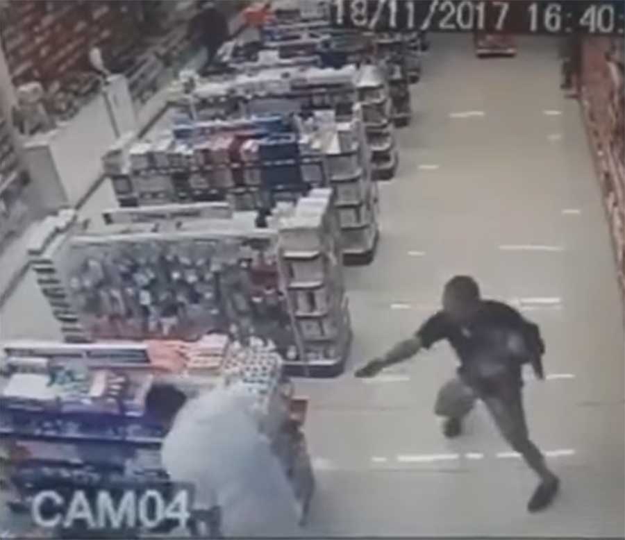 Enseguida, según muestra el video de las cámaras del circuito de seguridad, el policía, aún con su hijo en brazos, corrió hacia la parte delantera de la farmacia para disparar al otro asaltante.