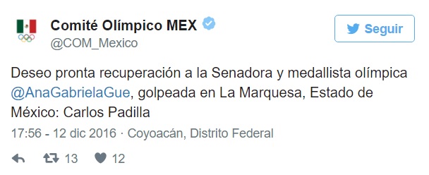 A través de su cuenta de Twitter, el Comité Olímpico mexicano deseó a la senadora una pronta recuperación luego del percance ocurrido en La Marquesa.