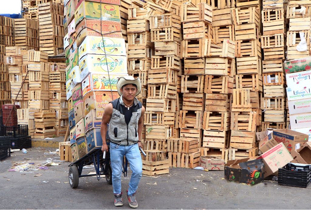 Este joven, como muchos otros, llegó a la capital en busca de mejores oportunidades laborales y lo encontró en el sector Envases Vacíos de la Central de Abasto de la Ciudad de México; ahora forma parte de los cargadores, reconstructores, estibadores y reclavadores de cajas de madera que se comercializan en este sitio por miles diariamente.