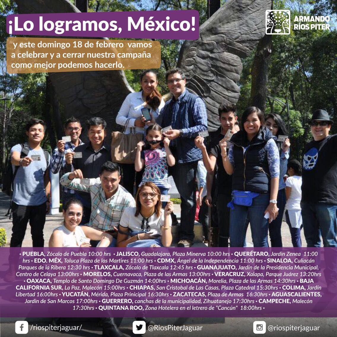 La presencia de Ríos Piter llegará también a Los Ángeles y Chicago en Estados Unidos, donde la comunidad migrante ha mostrado su respaldo al independiente. En tanto, en la Ciudad de México, Armando Ríos Piter, hará lo propio a las 12:00 horas en la Columna del Ángel de la Independencia, y con ello cierra 127 días recorridos por el país, en la búsqueda de apoyos ciudadanos.