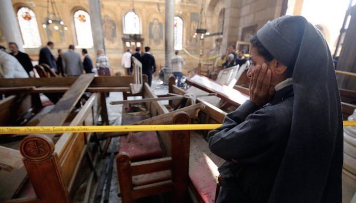 El ataque ocurrió mientras se oficiaba el servicio dominical, en la sección para mujeres de la iglesia de San Pedro y San Pablo, junto a la catedral de San Marcos, en la capital egipcia, de acuerdo con los reportes de autoridades locales.