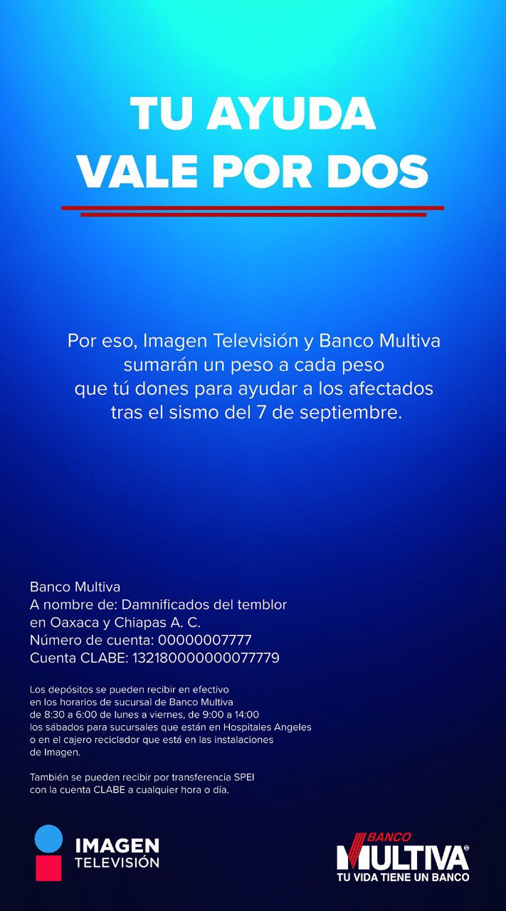 En este sentido, informó que a través de la cuenta número 00000007777 de Banco Multiva a nombre de Damnificados del Temblor en Oaxaca y Chiapas AC, por cada peso que los mexicanos donen Imagen Televisión y la institución bancaria aportarán un peso más para contribuir a la reconstrucción y recuperación de esos estados.