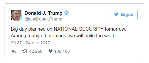 «Un gran día planeado sobre SEGURIDAD NACIONAL mañana. ¡Entre otras cosas, vamos a construir el muro!», se puede leer en un tuit lanzado el día de ayer.