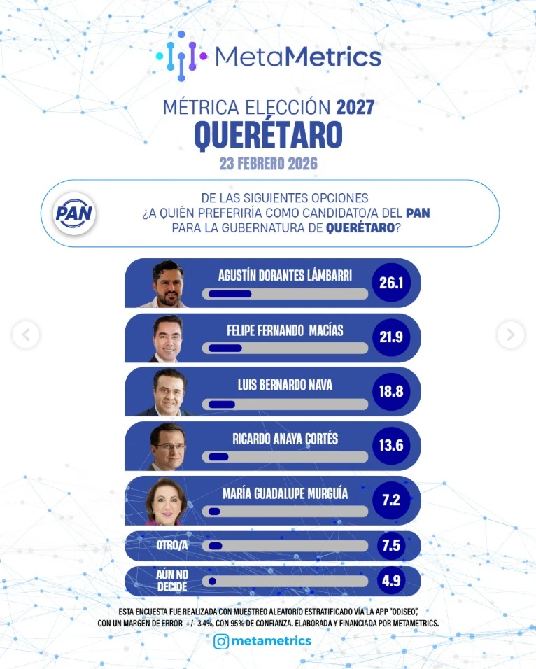 De acuerdo con la encuesta, Dorantes encabeza las preferencias con 26.1%, seguido por Felipe Fernando Macías con 21.9%, Luis Bernardo Nava con 18.8%, Ricardo Anaya con 13.6%, y María Guadalupe Murguía con 7.2%. Otro perfil registra 7.5%, mientras que 4.9% aún no decide.