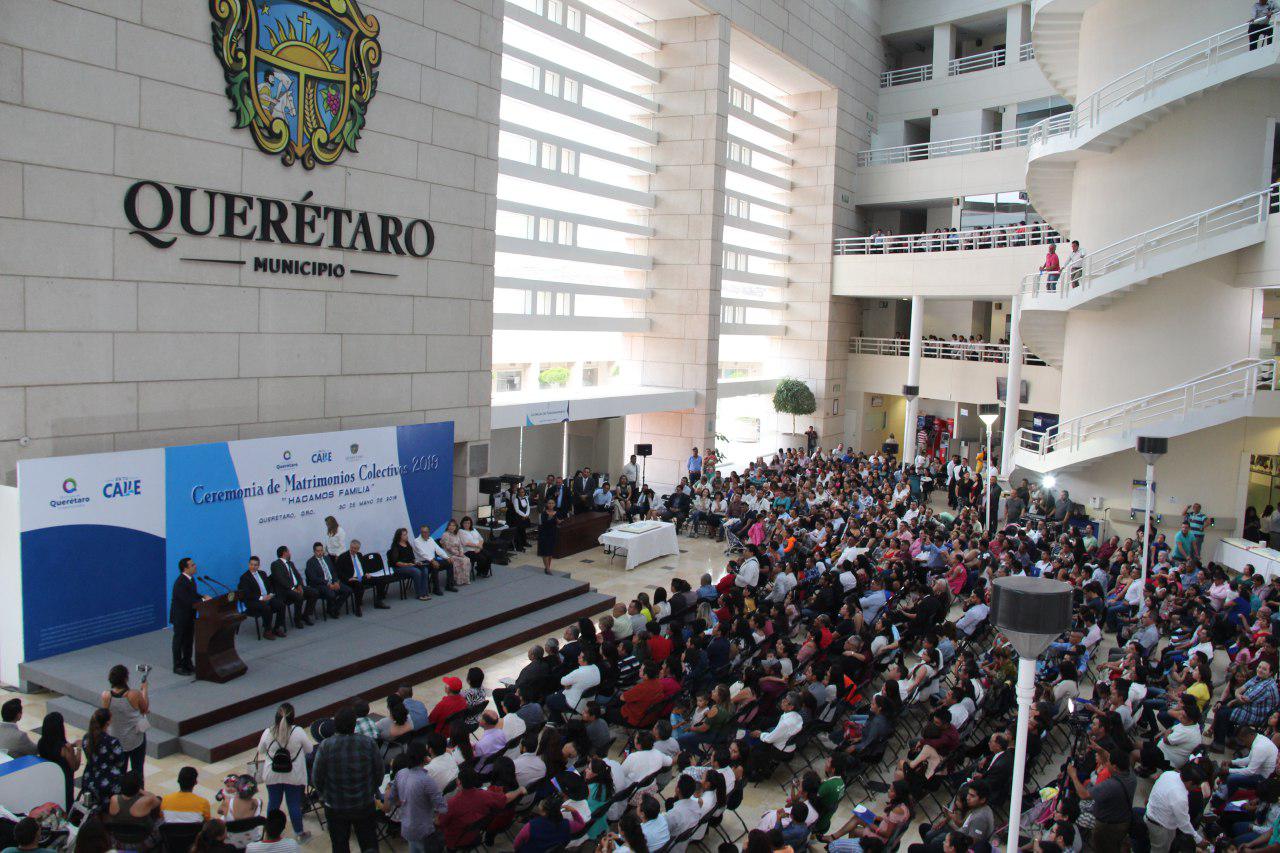 Querétaro, 31 de mayo.- Con el objetivo de fomentar la unión y bienestar familiar como parte de la construcción de una sociedad de paz, el Municipio de Querétaro llevó a cabo la ceremonia de Matrimonios Colectivos 2019 “Hagamos Familia”, la cual estuvo encabezada por Luis Nava, Presidente Municipal y que benefició a 662 parejas.