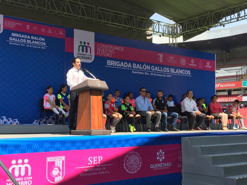 Querétaro, 26 de mayo.- El gobierno del estado, en conjunto con el equipo Gallos Blancos de Querétaro, realizó el lanzamiento del programa “Brigada Balón”, el cual tiene como objetivo llevar academias de futbol a los 18 municipios de la entidad.