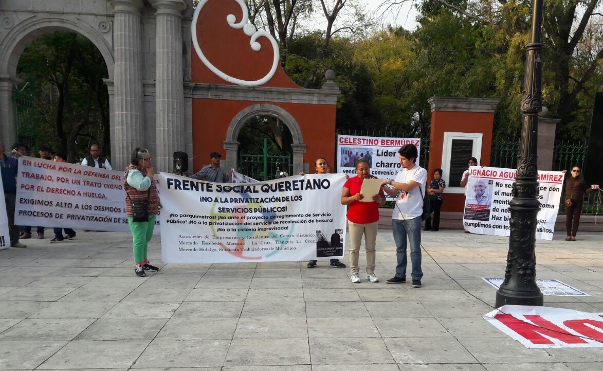 Querétaro, 4 de febrero.- Integrantes de diferentes asociaciones civiles se manifestaron al exterior de la Alameda Hidalgo en contra de la instalación de parquímetros y del nuevo reglamento de mercados.