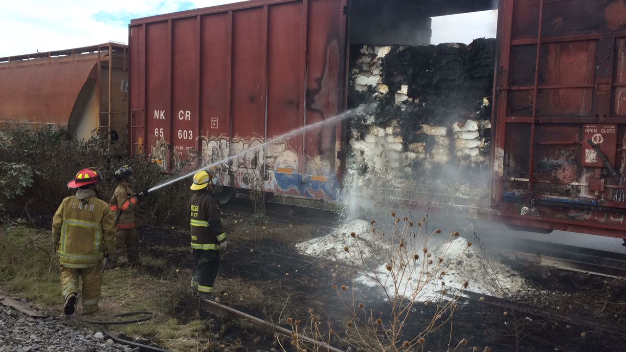 Querétaro, 5 de diciembre.- Integrantes del cuerpo de bomberos de El Marqués llegaron a la estación Viborillas del ferrocarril para atender un incendio en un vagón cargado con almidón de maíz, incendio que al parecer fue provocado.