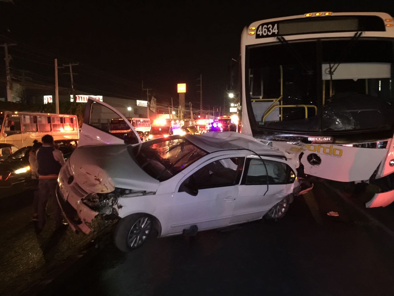 Con el primer impacto, provocado por el camión de pasajeros, el auto compacto de marca Volkswagen fue arrastrado por más de 10 metros sobre la cinta asfáltica golpeando así a un taxi que estaba detenido por el exceso de vehículos en la avenida.
