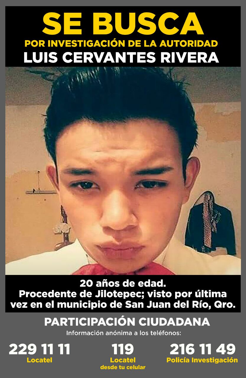 Querétaro, 5 de enero.- La fiscalía general del estado solicita la colaboración de la ciudadanía para localizar a Luis Cervantes Rivera, quién se encuentra bajo investigación por incitar a la violencia en el municipio de San Juan del Río.