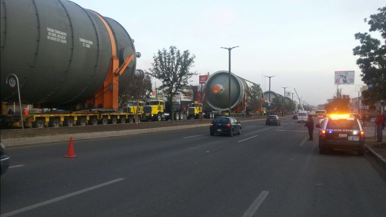 Querétaro, 16 de marzo.- Las Calderas Gigantes pasaron ya por el paseo central del municipio de San Juan del Río, y esperan en las próximas horas poder tomar la carretera México – Querétaro, rumbo a la refinería de Tula, en Hidalgo.