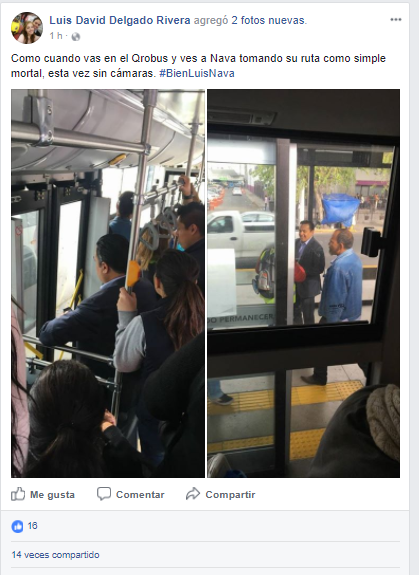 “Como cuando vas en el Qrobus y ves a Nava tomando su ruta como simple mortal, esta vez sin cámaras”, publicó Luis David Delgado Rivera en su cuenta de Facebook. Algunos usuarios de redes felicitaron al funcionario por tener la iniciativa, otros tantos lo criticaron.