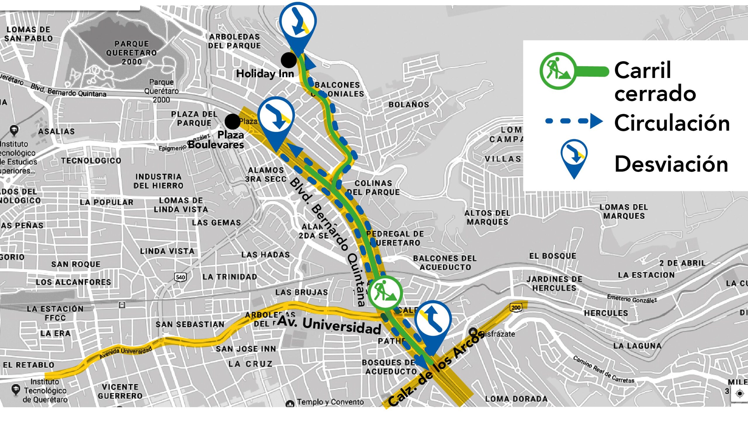 Si usted circula en sentido norte a sur sobre el Boulevard Bernardo Quintana, podrá desviarse a carriles laterales en la incorporación a la altura de Álamos 3ª sección. Para los usuarios que utilizan el anillo vial Fray Junípero Serra hacia el Boulevard, en el sentido norte a sur, podrán desviarse a los carriles laterales pasando el Holiday Inn Diamante, y quienes transitan en sentido sur a norte por el Boulevard, podrán desviar su circulación al pasar Calzada de Los Arcos.