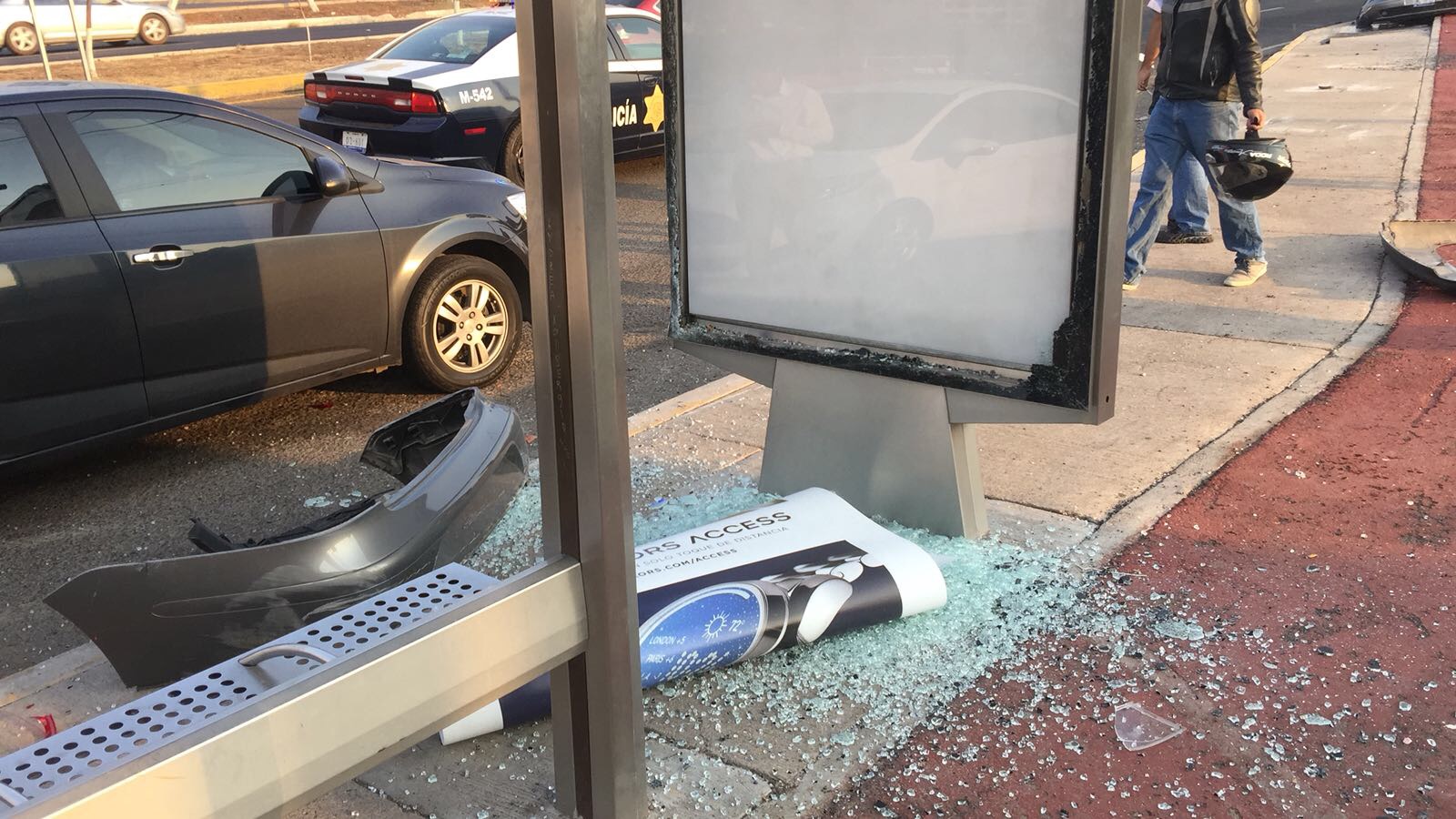Con la velocidad a la que circulaba el auto brincó la cuneta llegó a los carriles laterales, destrozó las plantas, y chocó en contra de un parabus, destruyendo los cristales y el mobiliario de aluminio.