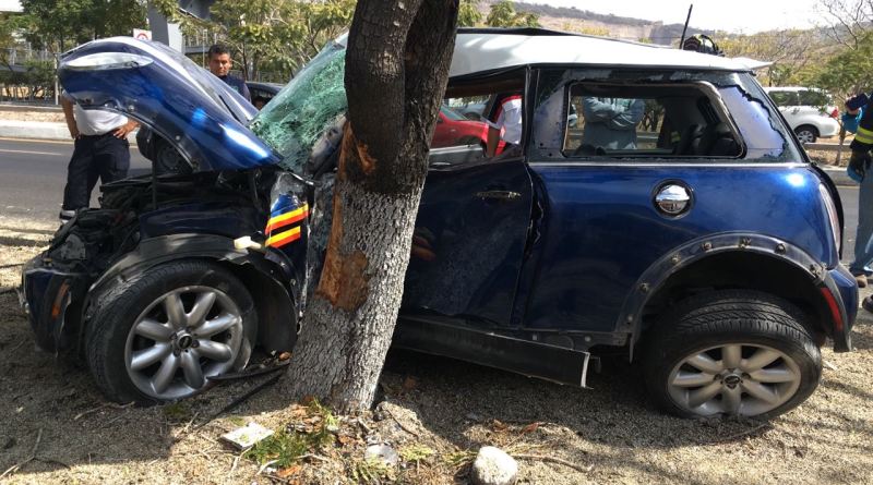 Querétaro, Qro. a 26 de enero 2018.- Por exceso de velocidad un vehículo Mini Cooper terminó impactado contra un árbol de Paseo de la República. La conductora, que se dirigía a la Ciudad de México, al llegar al puente de Jurica perdió el control de su vehículo, terminando sobre el camellón.