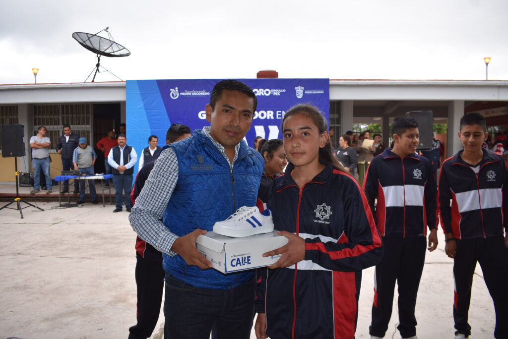 Pedro Escobedo, 6 de noviembre.- La Presidencia Municipal de Pedro Escobedo en coordinación con la Unidad de Servicios para la Educación Básica en el Estado de Querétaro, en presencia de representantes de la Secretaría de Desarrollo Urbano y Obras Públicas Estatal, llevaron a cabo la entrega de calzado deportivo en las comunidades de La D Santa Bárbara, La Lira y Escolásticas.