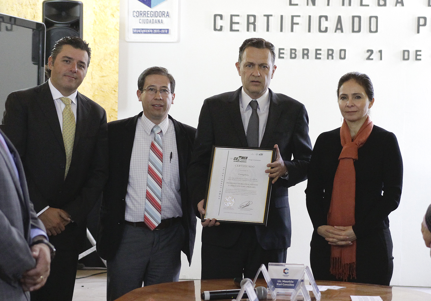 Querétaro, 21 de febrero.- Corregidora ocupa el primer lugar del estado en el cumplimiento del diagnóstico de Mejora Regulatoria, así lo dieron a conocer las autoridades durante la entrega del Certificado PROSARE a la demarcación.