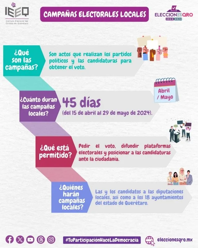 El 15 de abril iniciaron las campañas en suelo queretano, con 45 días por delante, donde los candidatos buscarán el voto de los queretanos con sus propuestas y proyectos de gobierno.