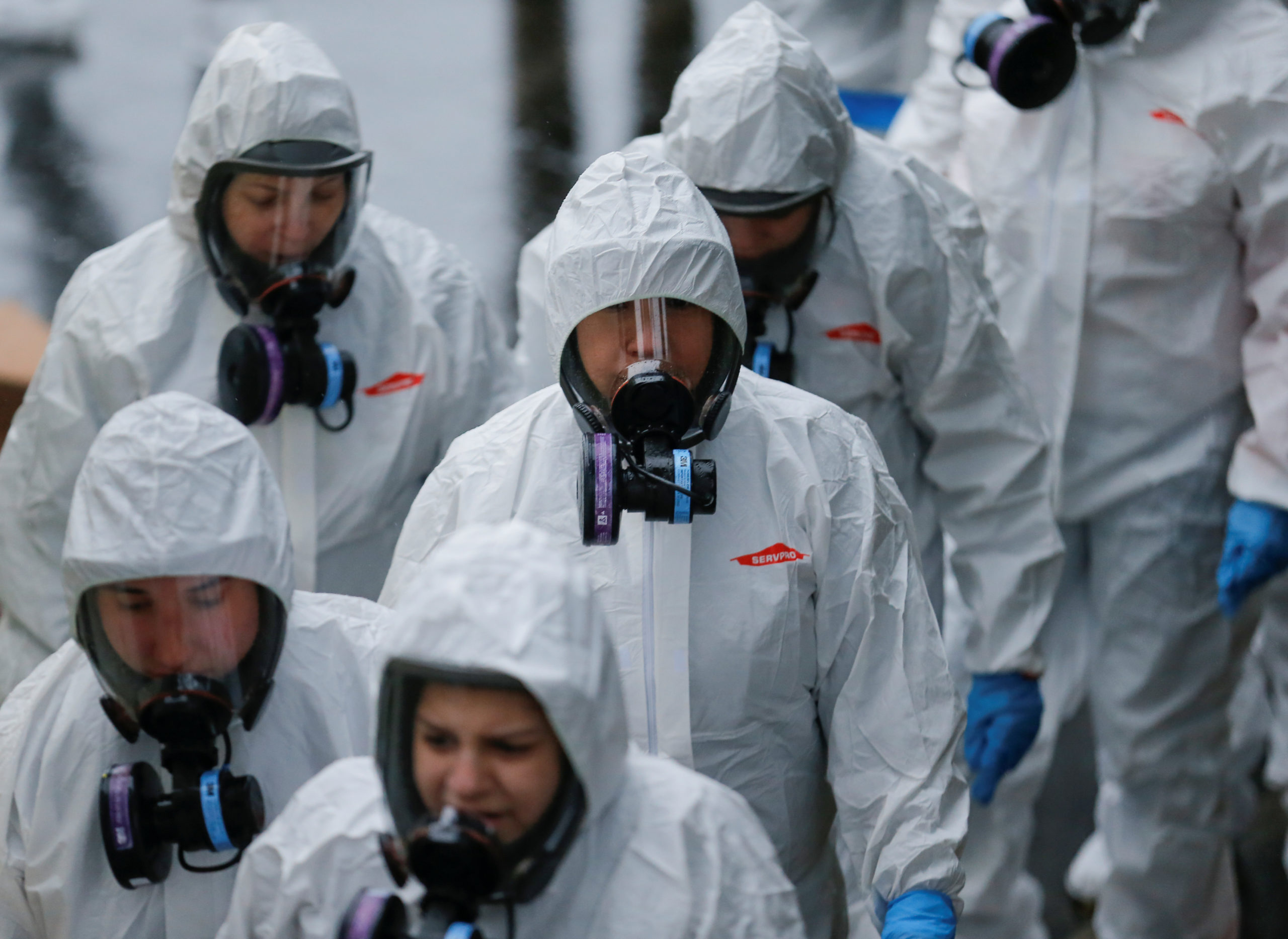 Servpro cleaners wear respirators, disposable suits and gloves as they enter Life Care Center of Kirkland, a long-term care facility linked to several confirmed coronavirus cases, in Kirkland, Washington, U.S. March 13, 2020. REUTERS/Lindsey Wasson