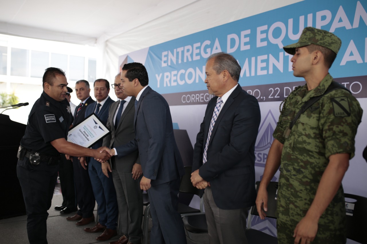 Querétaro, 22 de agosto.- Con el objetivo de dar continuidad al fortalecimiento de la Secretaria de Seguridad Pública y Tránsito Municipal, de Corregidora, se realizó la entrega de equipamiento y estímulos al desempeño policía, ceremonia encabezada por el presidente municipal Josué David Guerrero Trápala.
