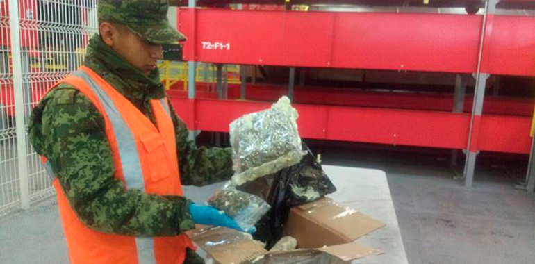 Queretaro, 20 de octubre.- La Secretaría de la Defensa Nacional a través de la Comandancia de la 17/a. Zona Militar, informo que en la madrugada de este jueves, detectaron droga, específicamente marihuana prohibida por la ley, durante una revisión que se llevo a cabo en una bodega de paquetería que se encuentra en las instalaciones del Aeropuerto Intercontinental de Querétaro (A.I.Q.).