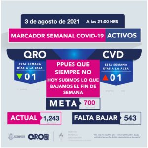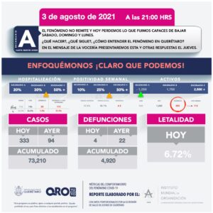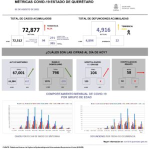 Registro de 67,001 altas. Con aislamiento y manejo en domicilio 798 pacientes. Hay 162 hospitalizados, 58 de ellos graves. Se han registrado 4,916 defunciones #ViveSinContagiarte pic.twitter.com/xQhNwB50pk— SSalud Queretaro (@SSalud_Qro) August 2, 2021