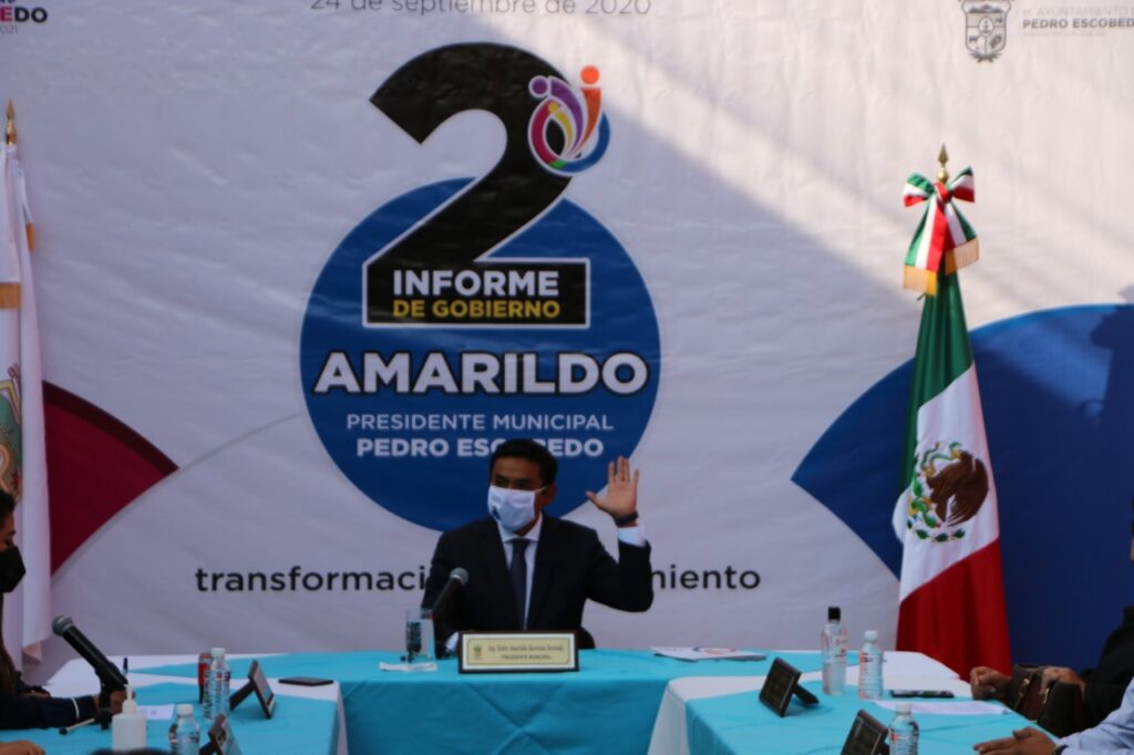 En Sesión Solemne Ordinaria de Cabildo, llevada a cabo en el patio de la Presidencia Municipal de Pedro Escobedo, el Alcalde Amarildo Bárcenas Reséndiz, con base en establecido en el Artículo 37 de la Constitución Política del Estado de Querétaro, el Articulo 31 en su fracción 11 de la Ley Orgánica del Municipio y en el Artículo 99 fracción segunda del Reglamento Interior del Ayuntamiento del Municipio de Pedro Escobedo, realizó este día la entrega de su Segundo Informe de Gobierno ante el Pleno del H. Ayuntamiento.