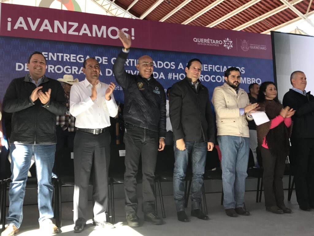 Querétaro, 10 de enero.- Autoridades estatales y municipales realizaron la entrega de certificados a beneficiarios del programa de vivienda «Hombro con hombro», que impulsa la secretaria de desarrollo social en la entidad.