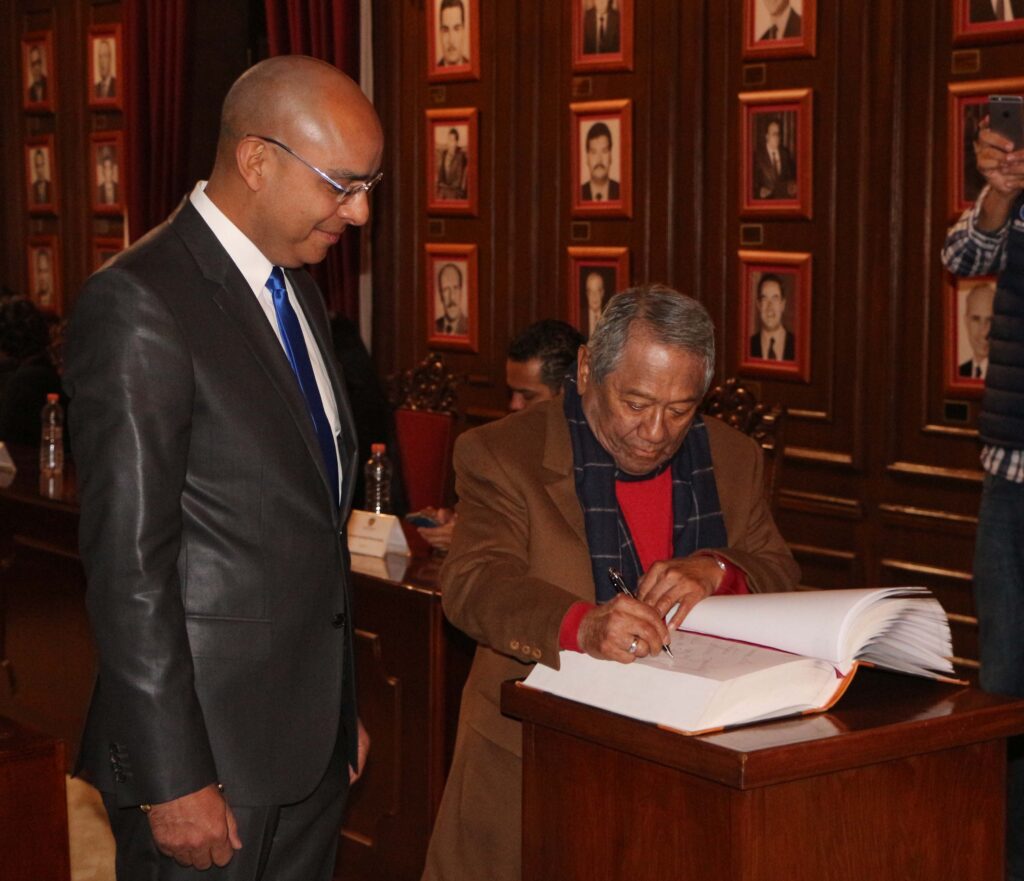 Querétaro, 20 de noviembre.- En Sesión de Cabildo llevada a cabo en Palacio Municipal, el Presidente Municipal de Querétaro, Marcos Aguilar Vega en representación del Ayuntamiento de Querétaro, entregó las llaves de la ciudad al cantautor mexicano y Presidente de la Sociedad de Autores y Compositores de México (SACM), Armando Manzanero Canché.