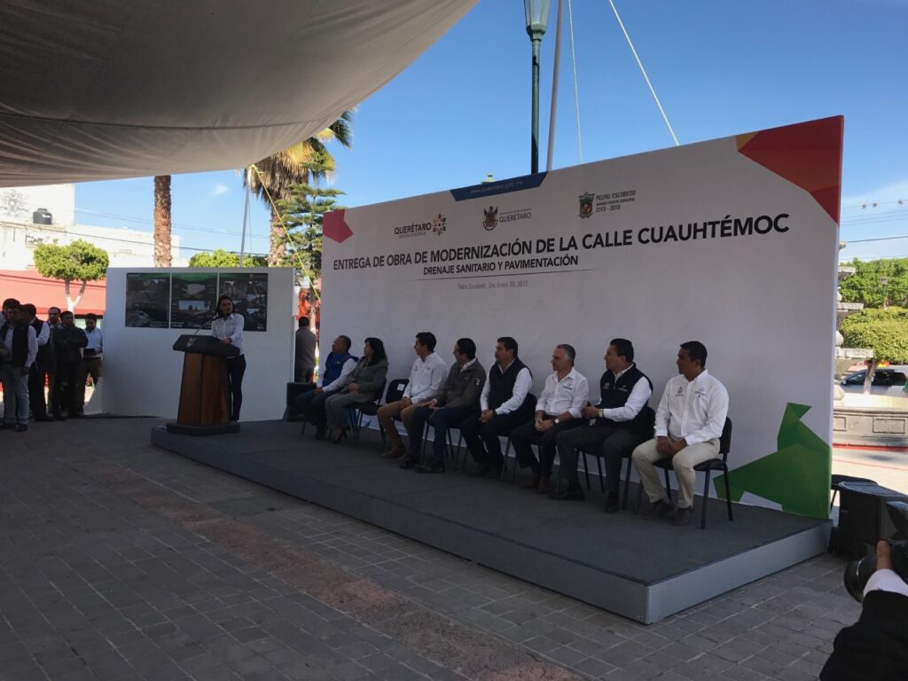 Querétaro, 20 de enero.- Autoridades estatales encabezaron la entrega de pavimentación y drenaje, en la calle de Cuauhtémoc, de la cabecera municipal de Pedro Escobedo.
