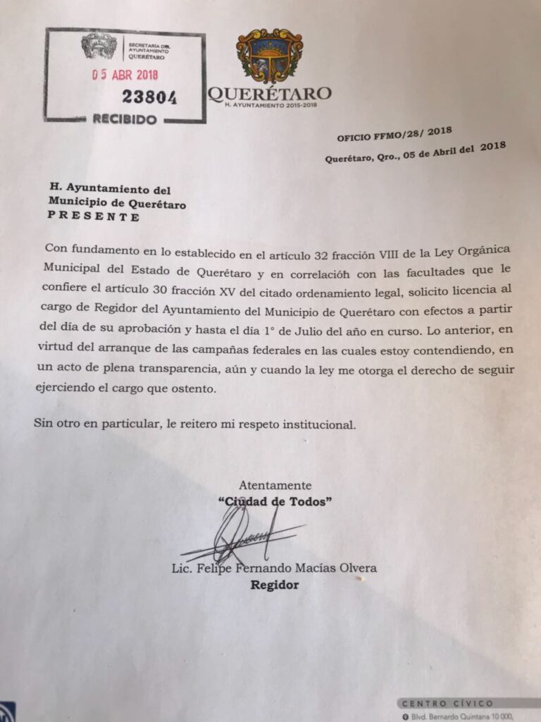 Querétaro, 6 de abril.- El Candidato a Diputado Federal por el 4to Distrito de Querétaro por la coalición Por México al Frente, Felipe «Felifer» Macías, pedirá licencia a su cargo como regidor del Ayuntamiento del Municipio de Querétaro, para continuar su campaña como candidato.