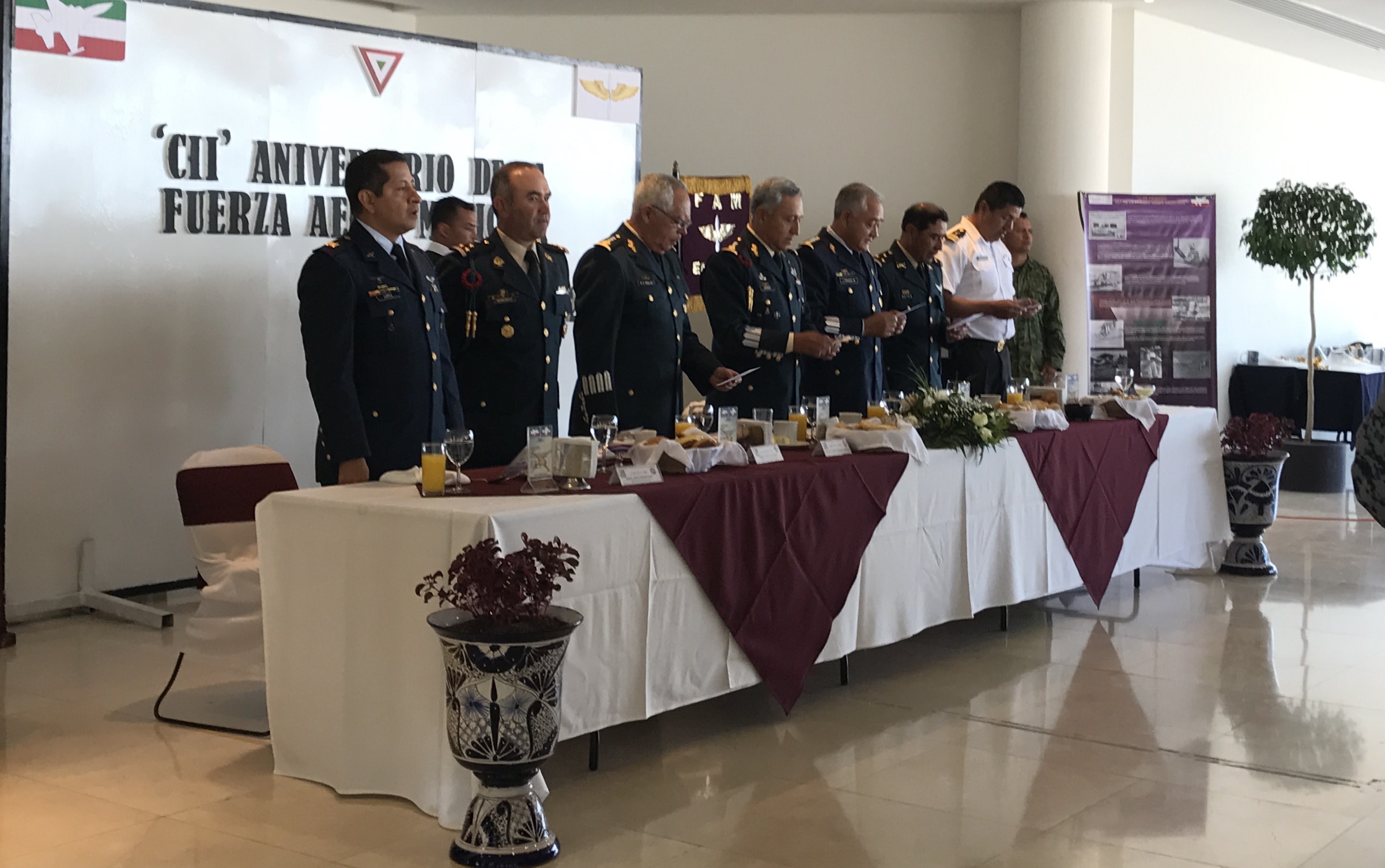 Querétaro, 10 de febrero.- Autoridades Militares Conmemoraron en Querétaro el 102 aniversario de la Fuerza Área, en un desayuno donde estuvieron presentes elementos operativos de la corporación.