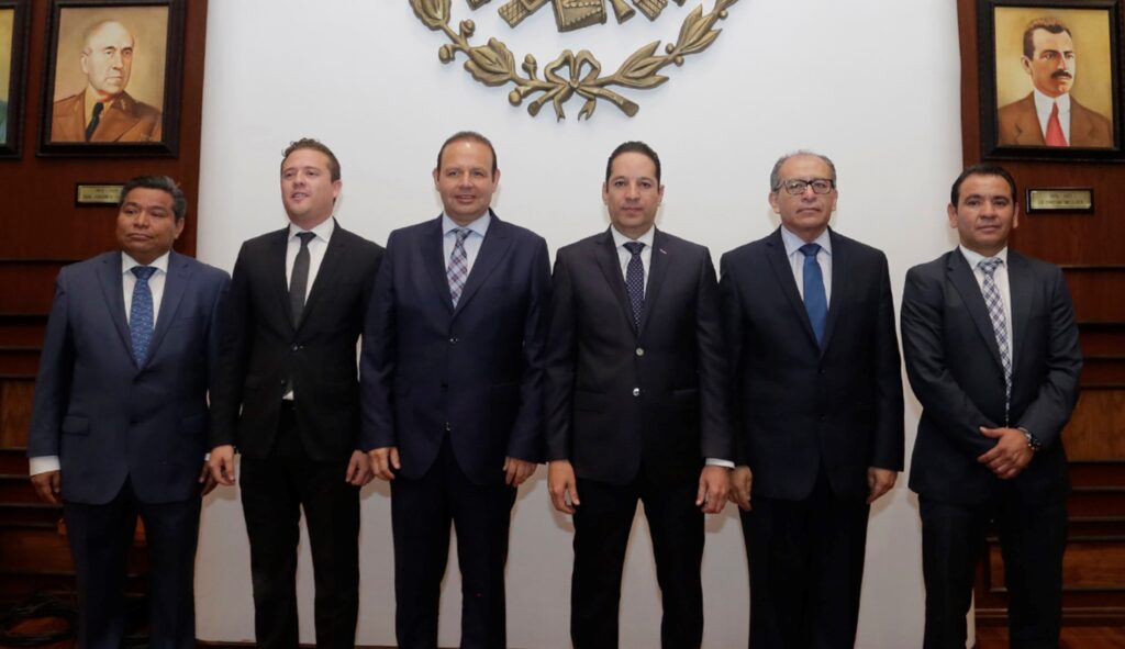 Querétaro, 5 de marzo.- El gobernador del estado Francisco Domínguez Servién tomó protesta a Rogelio Vega Vázquez Mellado como Jefe de la Oficina de la Gubernatura; a Rodrigo Ruíz Ballesteros, secretario de la Juventud; a Arturo Torres Gutiérrez, encargado de Despacho en la Secretaría de Desarrollo Social; y a José Carlos Arredondo Velázquez como encargado de Despacho en la Secretaría de Educación, quienes en sus nuevos cargos asumen la responsabilidad de conducir el crecimiento de la entidad.