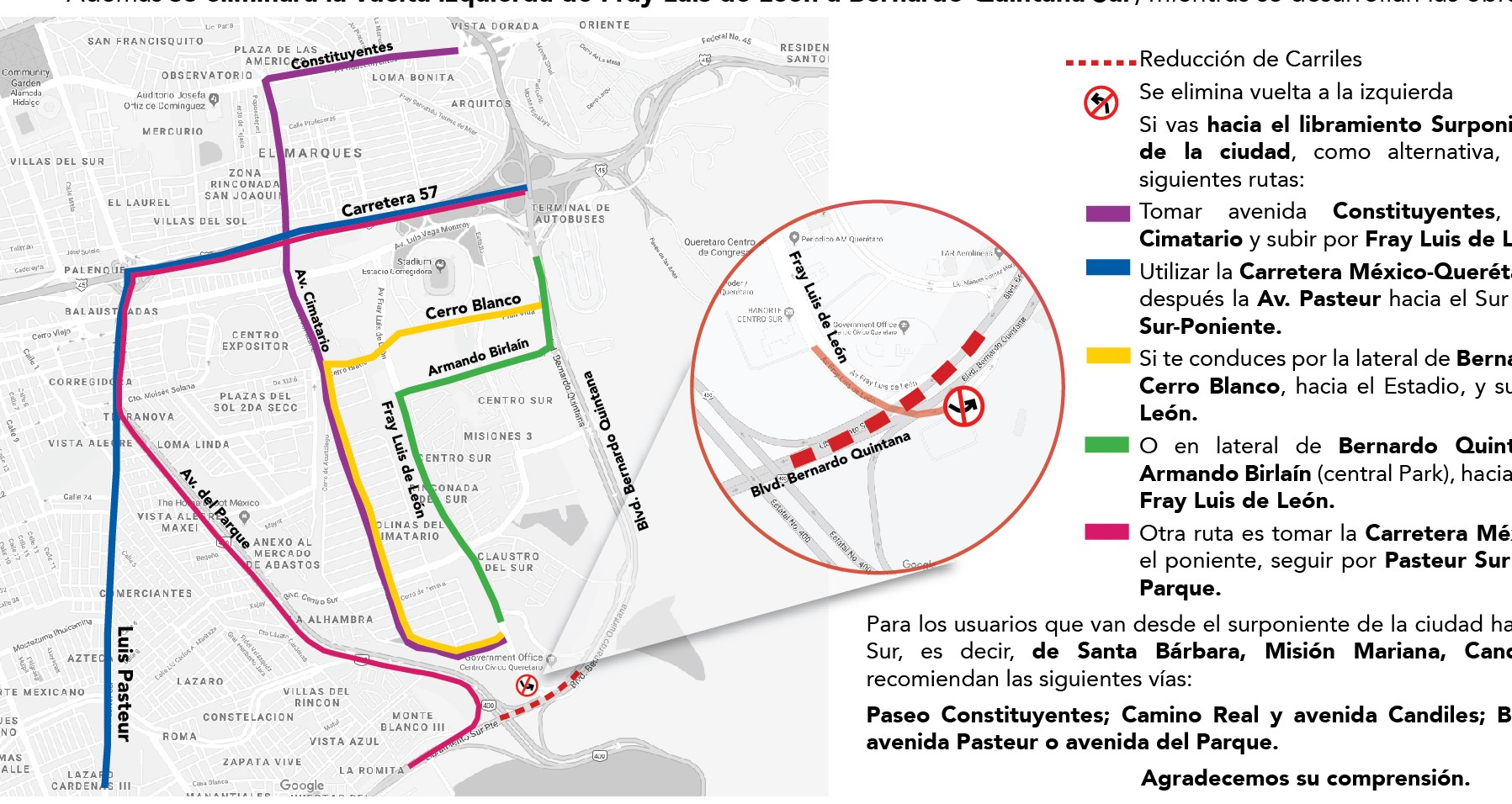 Además se eliminará la vuelta izquierda de Fray Luis de León a Bernardo Quintana Sur, mientras se desarrollan las obras.