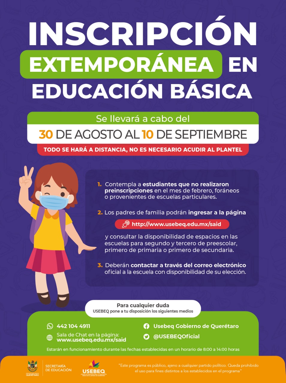 La inscripción extemporánea en escuelas de educación básica pública se llevará a cabo a distancia, no acudas al plantel; esta inscripción se llevará a cabo del 30 de agosto al 10 de septiembre y contempla a estudiantes que no realizaron preinscripción en el mes de febrero, incluidos foráneos o probados de escuelas particulares.