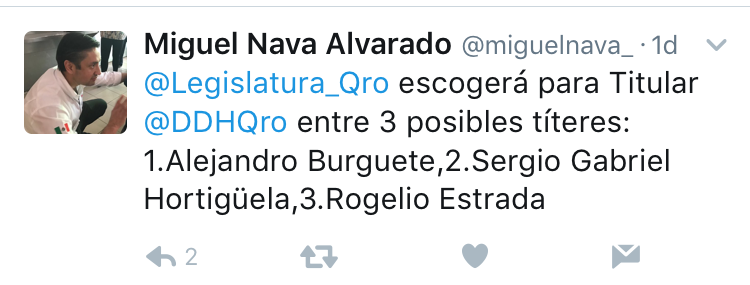Querétaro, 7 de febrero.- El ahora ex ombudsman Miguel Nava Alvarado, el mismo que en su momento señaló que su salida de la Defensoría de los Derechos Humanos de Querétaro  se debía a que  era un agente incómodo a los intereses del gobierno, dijo a  través de su cuenta de Twitter que la Legislatura Local escogerá para ser titular de este organismo a tres “títeres”, refiriéndose así a quienes hoy por hoy suenan fuerte para ocupar la vacante en el estado.