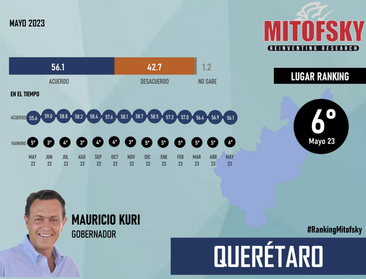 Mauricio Kuri González, gobernador de Querétaro se mantuvo como uno de los gobernadores mejor evaluados del país, al obtener 56.1% de aprobación ciudadana durante el mes de mayo de 2023.